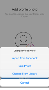 You have a few ways you can select a photo. If you have connected your account to facebook you can choose one from there. You can take a photo direct from your phone, you will need to allow access to your phone. Or you can import from your phones library.