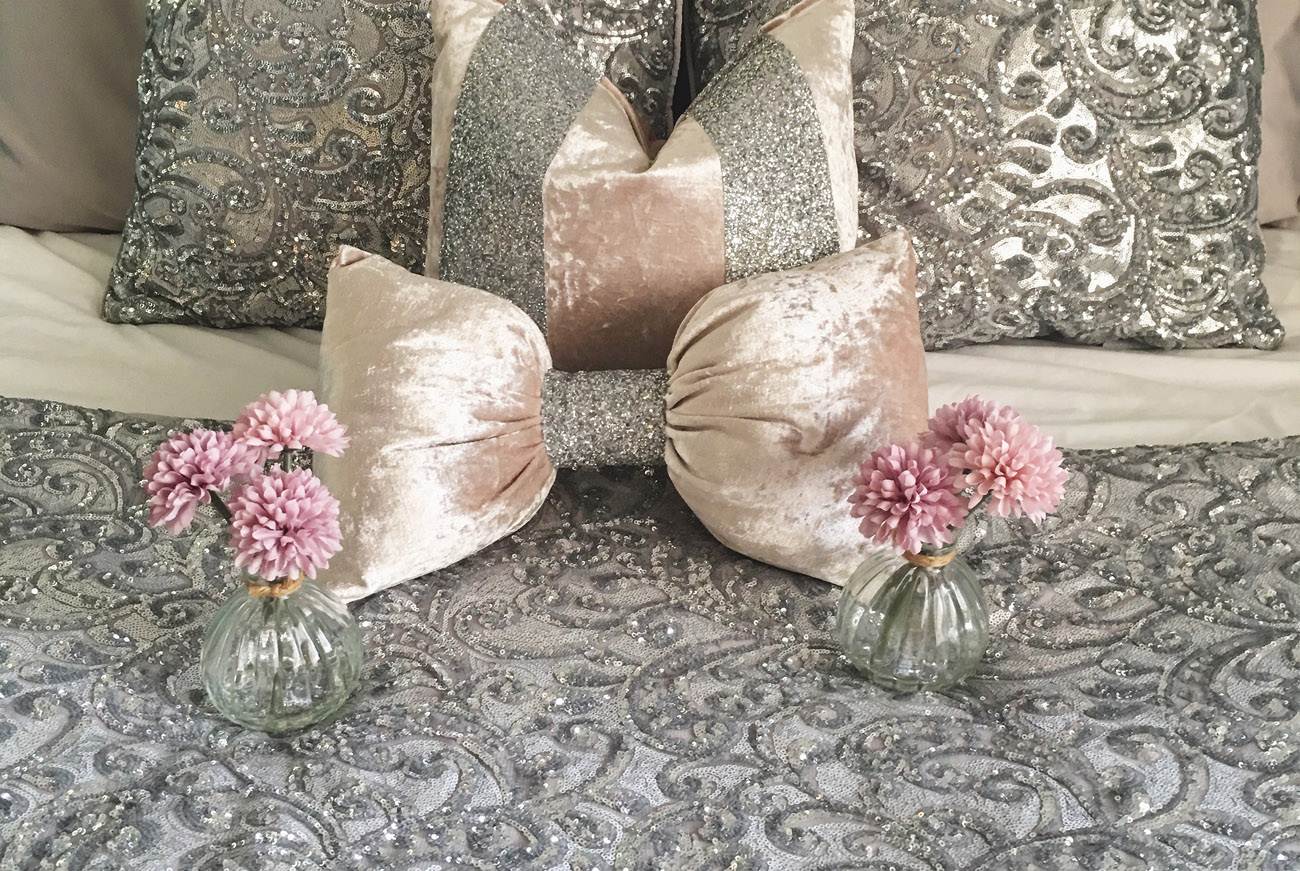 The glittery panels sparkle and really do add a touch of glamour. The bolsters even has a beautiful gem at each end.